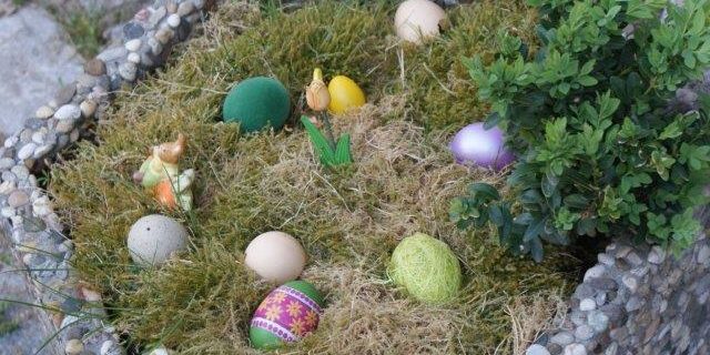 Descobri: sim, algo sutil mudou em mim mesma no ano passado, quando passei a Semana Santa na Alemanha. Logo na chegada, numa caminhada na pequena cidade de Frickenhousen am Main, onde decidimos pernoitar,  fiquei encantada com a decoração de Páscoa. A cada novo cantinho, numa janela, arbusto, fonte ou ao virar uma esquina, encontrava graciosas decorações com ovos pintados, fitas, coelhinhos ou ainda ovos de pedra, numa delicadeza sem fim. Por trás daquelas imagens, podia imaginar o processo de criá-las, talvez com avós, pais e suas crianças dedicas à escolha dos objetos, à pintura, a sua organização de forma tão estética e cuidadosa naquele espaço escolhido. O caráter artesanal falava alto, contrastando com nossa Páscoa industrializada de ovos enrolados em papel brilhante, pendurados com ganchos plásticos no alto das gôndolas dos supermercados. Não, pelo contrário: os ovos e decorações me remetiam a momentos acolhedores, íntimos, divertidos. Aquilo me tocou mais do que eu mesma pude imaginar… Suspeito, agora, por que: por que foi feito por gente reunida amorosamente em torno de um ritual e seus símbolos. Cada ovo era um gesto. Eram ovos com aura — como arte original tem aura, também!